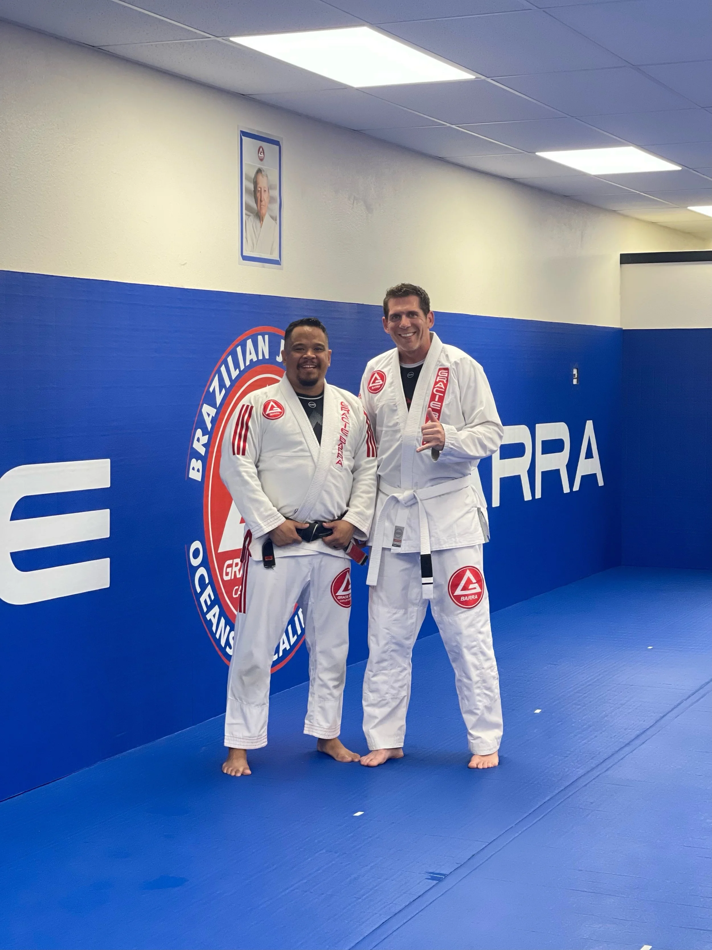 Things calmed down as we settled in to our new home in Oceanside but there was no question that crime was worse and I didn’t feel as safe walking around in our community. This was amplified by my concerns about becoming a new first time father and protecting my family. It naturally led me to considering getting self defense training, something I had not practiced in many years. I started searching on google for local Jiu Jitsu schools and one caught my attention, Gracie Barra (pronounced Ba-Ha). While meeting my wife’s new colleagues at the Camp Pendleton on-base bowling alley I noticed one of them, Chuck, wearing a Gracie Barra t-shirt. He told me that it was a great school and I should come check it out on a Thursday evening in August.